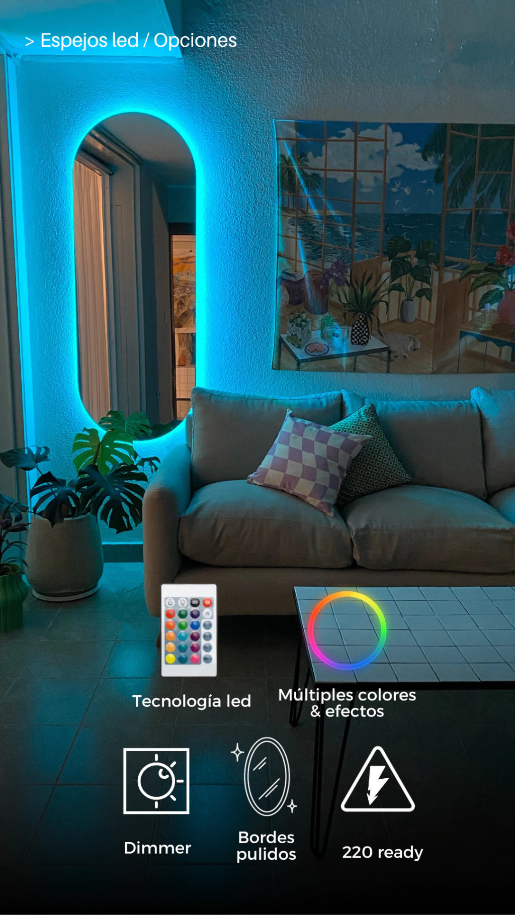 💥💥 Para los espejos LED podés encargar diferentes sistemas: RGB: Es el sistema "arcoíris" que te trae 16 colores, incluída luz cálida y fría. Esto viene con un control remoto con efectos de luces también. O por otro lado, el sistema TOUCH, que se utiliza para prender y apagar el espejo desde un botón tácti. En éste último podes elegir 1 solo color de luz (cálida o fría)- pero opcionalmente podes ponerle ambos tonos, así también como la línea esmerilada a los costados.